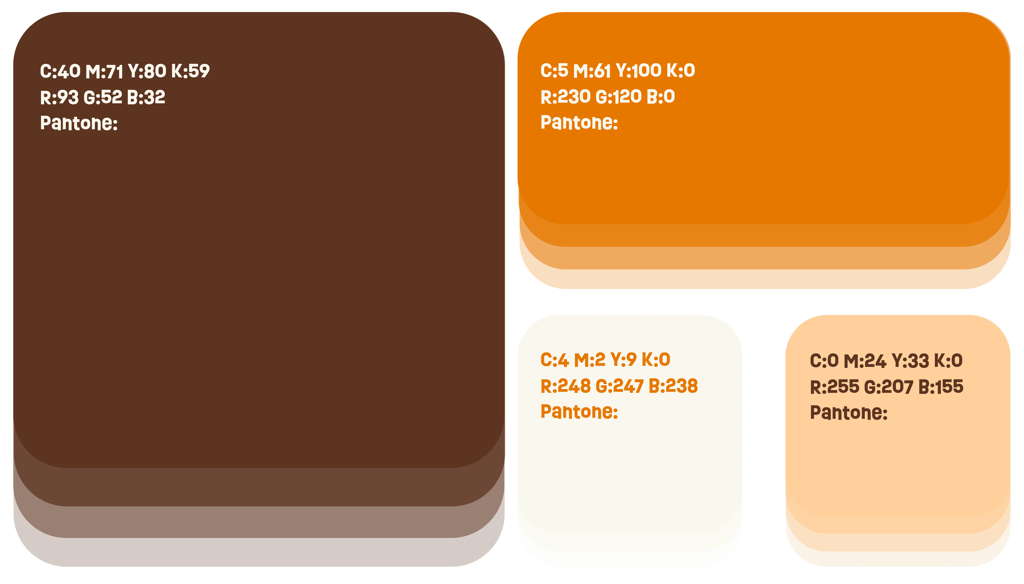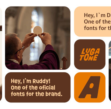 Brown forms the foundation of the identity, referencing the tradition of the Church and the symbolic strength of the cross, representing Christ’s sacrifice and the roots of faith that sustain the brand. In contrast, orange brings youthfulness and modernity, while also symbolizing the fire of the Holy Spirit: a living presence marked by movement, warmth, and renewal. It energizes the identity and connects faith to action.