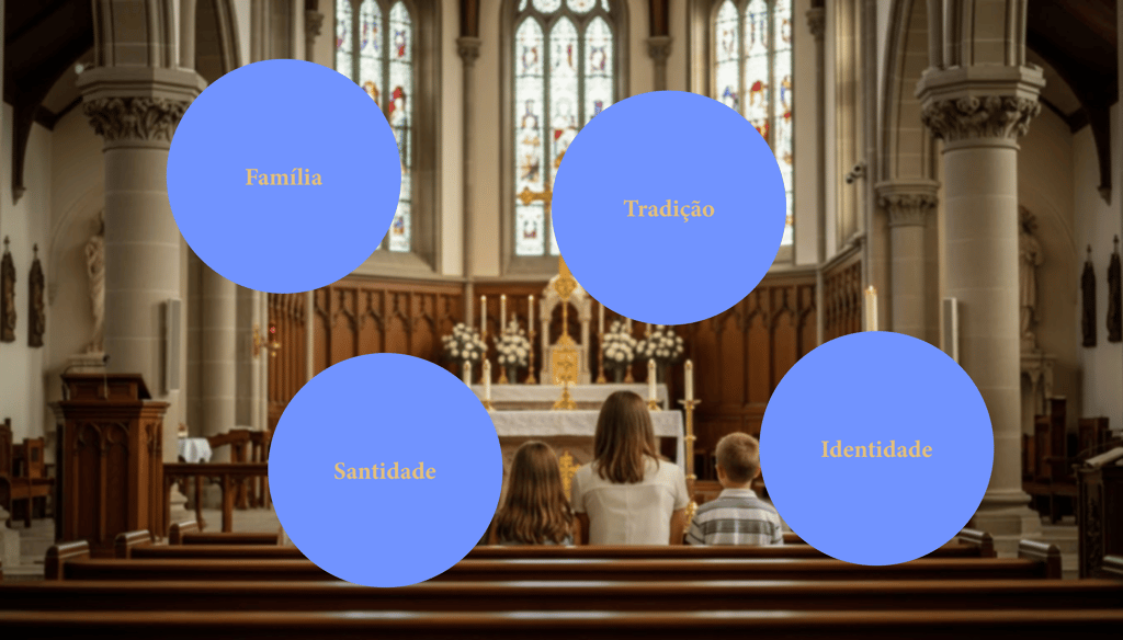 O marrom representa a tradição da Igreja, evocando humildade, história e fé enraizada. Já o dourado simboliza a beleza e a sacralidade da Igreja, expressando reverência, devoção e o valor do que é eterno.