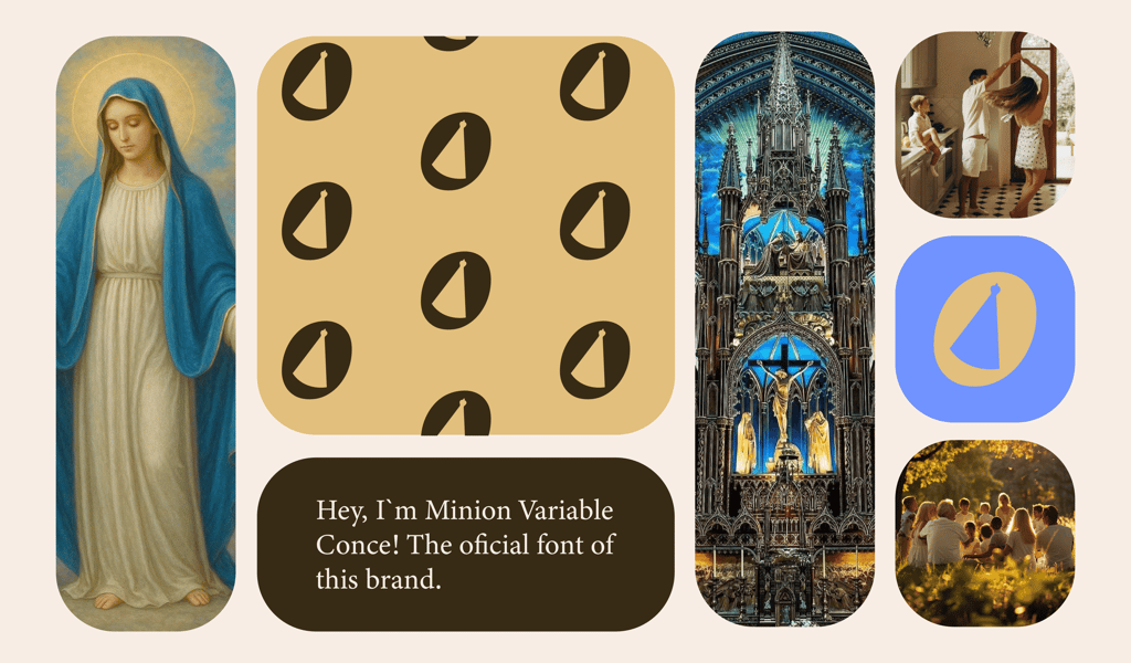 In the logotype, the slightly rounded edges soften the classical structure of the typeface, bringing a sense of kindness, closeness, and welcome. This decision symbolizes God’s merciful love and the tenderness of Our Lady, central pillars of the Catholic faith and of the brand’s essence.